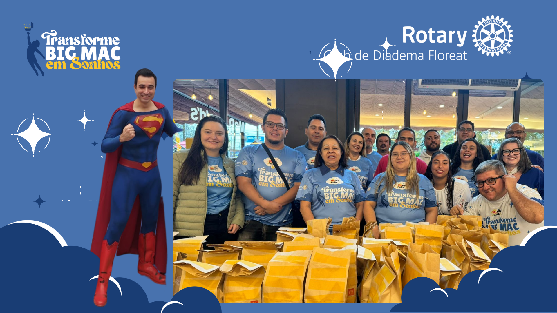 Neste McDia Feliz, nosso Clube se uniu para espalhar sorrisos e fazer a diferença! A Coordenação da Juventude do nosso Clube com o Rotaract Clube de Diadema Floreat, levaram 50 lanches para os Associação Amigos do Jardim Sapopema, 35 lanches para o Projeto de Futebol e 36 para o Instituto Nanny.